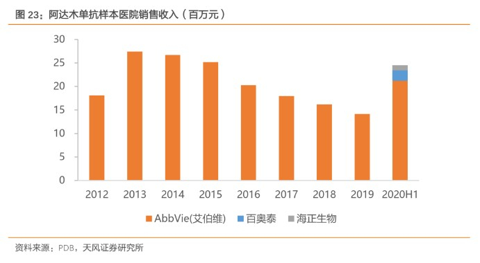 根据PDB的数据,2019年阿达木单抗的样本医院销售额为1400万元,艾伯维占据主要市场份额。伴随着更多国内企业的加入,阿达木单抗费用可能会继续下降,渗透率有望大幅提升。