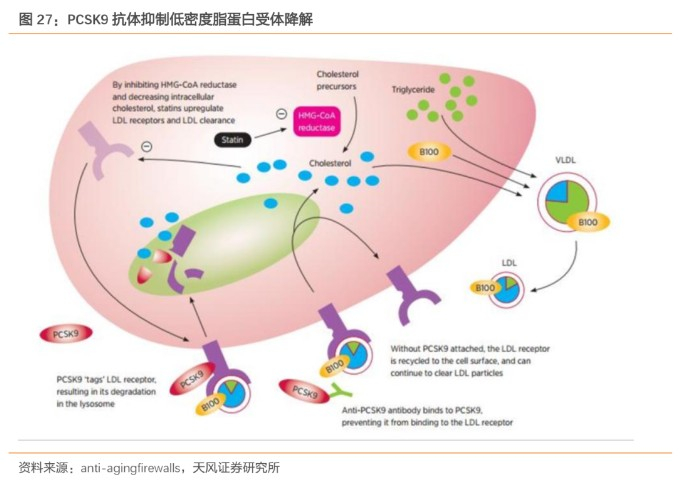 PCSK9抑制剂能阻断PCSK9酶,使更多的低密度脂蛋白受体可用于清除血液中的低密度脂蛋白,该产品拟用于治疗高胆固醇血症。作为新型降脂药物,PCSK9单克隆抗体本身有诸多优势,如对靶目标高度特异、安全性良好、半衰期更长、用药频率大大减低。与他汀类药物抑制胆固醇合成、减少胆固醇“来路”的机理不同,PCSK9抑制剂是增加胆固醇的“去路”,稳定LDL-R的数量,从而加速清除体内已经合成的胆固醇。