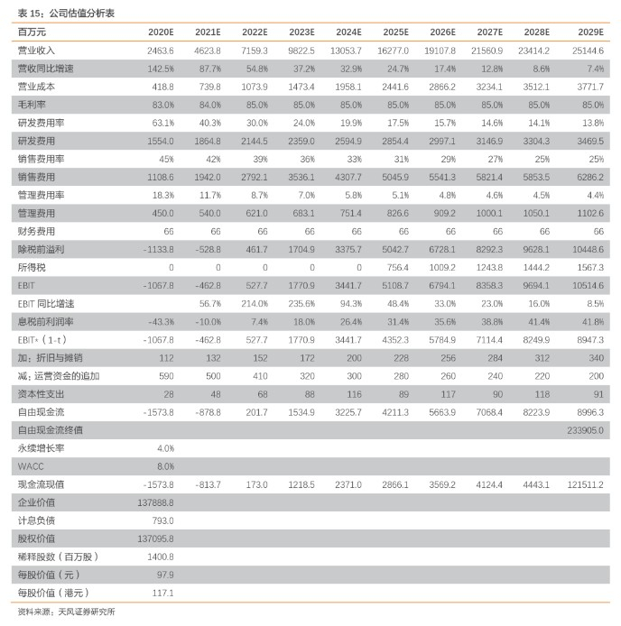 考虑到公司研发管线品种丰富,使用相对估值法难以反映管线药物价值,因此我们运用绝对估值法估值。核心假设包括:永续增长率取4%;折现率取8%。结合公司自由现金流折现模型及上述业绩预测,我们预计2020-2022年公司税前利润分别为-11.3亿元/-5.29亿元/4.62亿元,于2022年扭亏为盈,公司当前合理价值为1371亿元,每股价值为117.1港元,首次覆盖给予“增持”评级。
