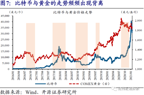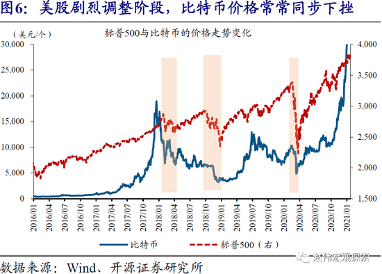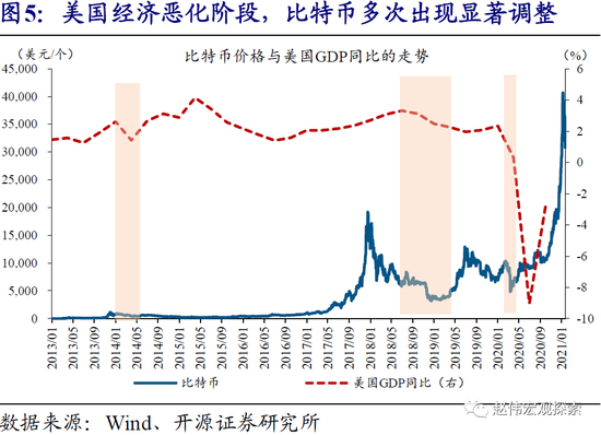 (3)比特币尚不具备避险属性;但是,由于能行使部分一般等价物职能及数量相对稀缺,比特币的价格实际上隐含了成为全球性“保值货币”的预期,在主流央行“大放水”阶段往往大涨。比特币目前可在部分国家替代官方法币,用于商品购买、金融交易等。同时,比特币的数量上限被锁定为2100万枚,较黄金更加稀缺。这一背景下,比特币被认为有望成为全球性“保值货币”,可对冲美元等滥发风险。