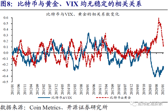 比特币尚不具备对冲风险偏好回落的属性;历史数据显示,风险资产剧烈调整阶段,比特币常常同步大跌,并与黄金等避险资产走势显著背离。虽然被部分市场人士认为具备避险属性,但比特币在风险资产剧烈调整阶段,常常同步下跌。例如,2018年后,美股标普500指数先后经历了3次剧烈调整,跌幅分别为8.5%、19.1%、33.7%;期间,比特币分别大跌21.6%、37.5%、32.4%,表现远不如黄金等避险资产。进一步回溯历史数据来看,比特币与黄金的走势频频出现背离,与衡量风险偏好的VIX指数之间也无稳健相关关系。