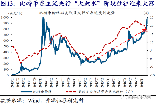 显然,比特币目前并不具备避险属性;由于能行使部分一般等价物职能及数量相对稀缺,比特币的价格实际上隐含了成为全球性“保值货币”的预期,在主流央行“大放水”阶段往往大幅上涨。作为一种去中心化的“电子现金”,比特币可在部分国家替代官方法定货币,用于商品购买、金融交易等活动。同时,特定算法下,比特币的数量上限被锁定为2100万枚,且产量在不断衰减,稀缺性方面更胜黄金。由于具备上述两种特征,比特币被认为有望成为全球性的“保值货币”。从历史数据来看,在主流央行“大放水”、美元等法定货币“泛滥”阶段,比特币价格往往迎来大涨。