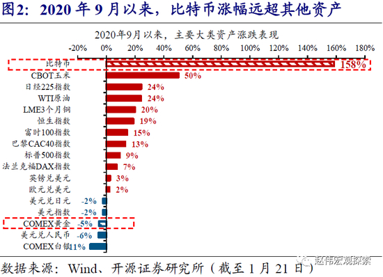 2020年9月以来,比特币价格持续、大幅上涨,引发市场广泛关注。截至1月21日,比特币价格在短短4个月内已经从11924美元大涨至30818美元,盘中更是一度突破40000美元、刷新历史新高。比特币接近160%的涨幅,远远超过了同期其他大宗商品,以及美股、美债等资产的表现。价格的持续、大幅上涨,使比特币成为近期市场的关注焦点。