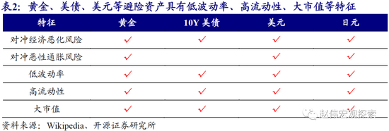 黄金及美债、美元等能成为优质避险资产,缘于能够对冲风险偏好回落,并具备低波动率、高流动性、大市值等特征。定义来看,避险资产指的是市场变化过程中,价格波动相对稳定的一类资产。与风险资产相比,避险资产的“避险属性”主要体现在能够对冲风险偏好回落。与此同时,避险资产中,波动率越低、流动性越高、市值越大的资产,越“优质”。黄金、美债、美元及日元等,均是优质避险资产。黄金因为可以同时对冲经济衰退和恶性通胀风险,并且天然稀缺、具备价值储藏功能等,也被称为避险资产之王。