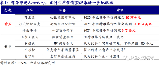 部分市场观点认为,比特币将取代黄金、成为全球新的避险资产之王,价格有望迎来进一步飙涨。伴随比特币价格大幅上涨,软银集团董事长孙正义表示,比特币将取代黄金、在2025年单价涨至10万美元。花旗银行分析师菲茨帕特里克的观点更加激进,认为2021年比特币单价有望涨至31.8万美元。当然,看多比特币声音比比皆是的同时,也有部分人士极度看空比特币。微软前董事长比尔·盖茨,及伯克希尔集团董事长巴菲特都认为比特币毫无价值。
