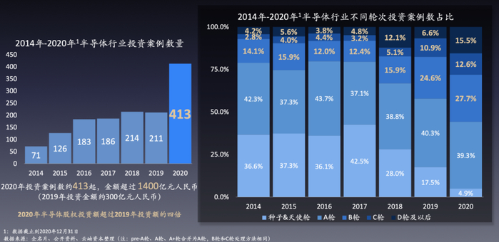 据云岫资本《2020年中国半导体行业投资解读》的统计,2020年半导体行业股权投资案例413起,投资金额超过1400亿元人民币,相比2019年约300亿人民币的投资额,增长近4倍,这也是中国半导体一级市场有史以来投资额最多的一年。
