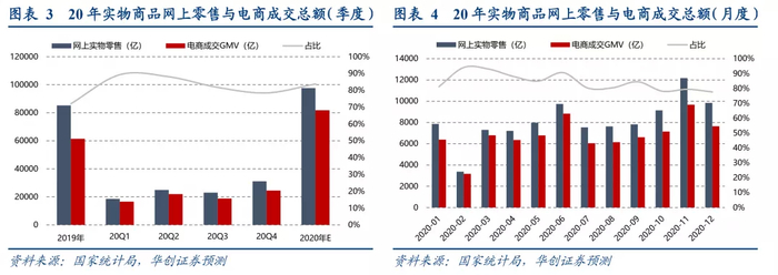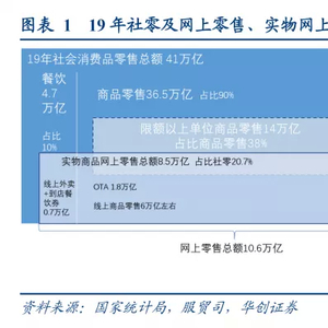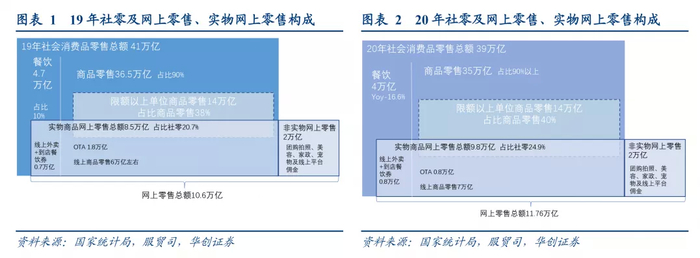社零的实物商品网上零售(2019年8.5W亿)中包含大约1.5-2万亿的OTA市场(包含线上酒店和旅游)和0.7万亿的外卖市场;电商真实成交6万亿左右。20年全年社零39万亿,其中商品零售35万亿,实物商品网上零售9.8万亿,yoy+14.8%。我们预计外卖市场0.8万亿,OTA市场约0.8万亿,排除两者干扰后,电商实际成交约7万亿。