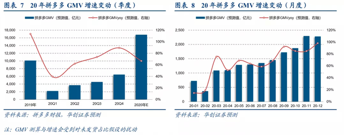 根据测算,我们预计拼多多GMV约1.7万亿,yoy+67%左右;主平台全年包裹数约303亿件,yoy+54%左右。全年包裹数占比行业包裹数36%(Q4占比42%左右);客单价从51.1元(2019年)提升至55.4元(2020全年)。预期多多买菜的GMV与成交规模将提振总体GMV与订单总数。预期21年 “拼品牌”将是拼多多再度发力品牌化商品的增长期,我们预期未来拼多多将持续享受信息流成交的红利,补足平台服务与物流短板。