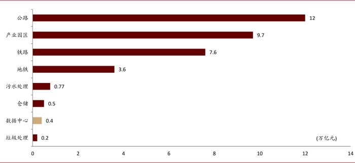 注:仓储物流、公路、铁路、地铁、互联网数据中心数字截至 2019 年底,其他截至 2018 年底。