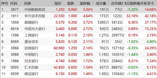 银行股成为少有上涨的股票,华兴资本受益于快手上市涨近5%,今年涨超40%;邮储银行、光大银行、工行、招行等涨超2%。