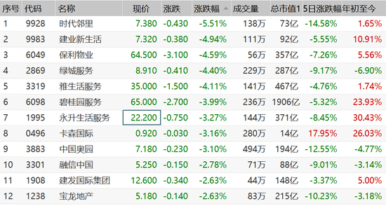 物业地产股走跌,其中,时代邻里跌5.5%,建业新生活跌4.9%,保利物业、绿城生活跌超4%,碧桂园服务、永升生活服务跌超3%。