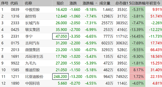 港股非必须消费股集体大跌,说好的新能源汽车呢。其中,中教控股跌超9%,耐世特跌超7%,长城汽车跌7.3%,李宁跌超6%,吉利汽车跌6.6%,九毛九跌超5%,比亚迪跌超5%。