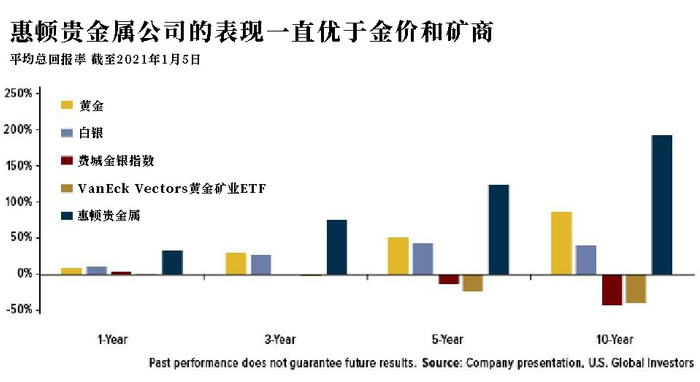 惠顿的表现也同样出色。无论以1年、3年、5年还是10年为期限来看,惠顿的表现不仅碾压实物黄金和白银,还远远优于矿业股和广受欢迎的VanEck Vectors黄金矿业ETF。