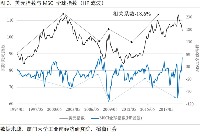 周颖刚教授认为,美元周期对全球贸易、股票市场、大宗商品价格、跨境资本流动、人民币汇率等都会产生影响。一是,美元指数与全球商品和服务出口相关系数为-44.6%,意味着弱美元将促进全球贸易和经济弹性,并有助于减少贸易失衡。二是,美元指数与MSCI全球指数(HP滤波)相关系数为-18.6%,意味着弱美元将推动股票市场上涨。三是,美元指数与CRB现货指数的相关系数为-20.3%,意味着弱美元将推涨大宗商品价格。四是,美元指数与全球投资组合证券净流入相关系数为-36.4%,意味着弱美元将促进全球资本跨境流入,推动资产价格上涨甚至出现泡沫。五是,美元指数与人民币兑美元汇率相关系数为82.4%,与CFETS人民币汇率指数相关系数为-37.7%,意味着弱美元可能带动人民币被动升值。