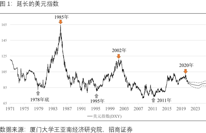 周颖刚教授认为,从1971年到2020年,美元指数已呈现两轮完整周期。关于市场争议焦点“是否存在第三轮美元周期?”,可以采用计量方法对美元指数进行延长:一是,模拟回溯70年代之前美元指数,美元指数或在1967-1968年左右存在一个顶点;二是,结合摩根士丹利、花旗银行等多个金融机构的预测进行组合,2021-2025年美元指数将进入弱势周期。