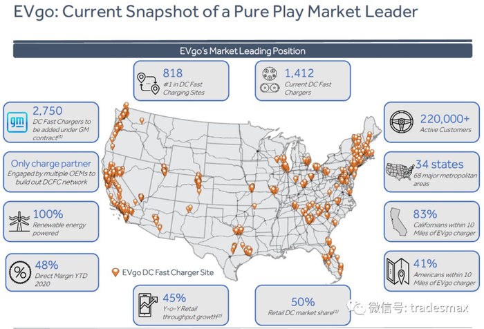目前EVgo在34个州有超过800快速直流充电站台,超过1400个充电桩,并且与 GM有合约,即将再建2750个充电桩。