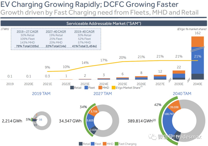 EVgo预计DCFC直流快速充电站将在2040 占整体充电市场份额的42%。而EVgo 预计自己可以占据这个细分市场份额的21%左右。