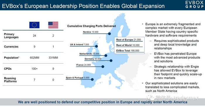 EVBOX是总部位于荷兰的一家充电桩公司。迄今为止已经建立了19万个充电桩,是目前所有充电桩公司当中最多的。现有充电桩主要集中在荷兰七万五千个,德国四万个,法国两万个,日耳曼一万个, 剩余欧洲地区加起来三万一千个,以及欧洲以外也有一万个, 分别在南美,北美,欧洲,亚洲都有站点。