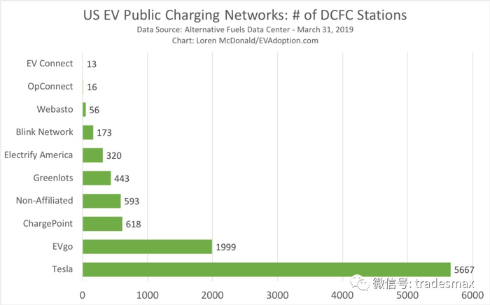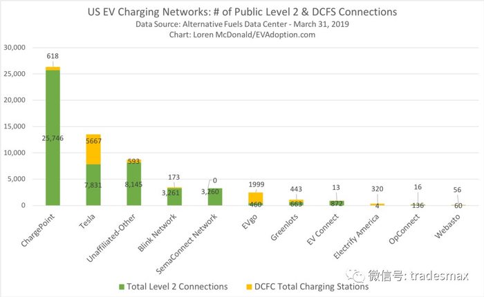 这张图显示的是ChargePoint在2级充电器上就排在第一,特斯拉第二,Blink第四,Evgo第六