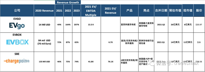 首先,从2020年的收益来看, EVGO的1400万相比EVBOX还有SBE是非常少了的。但EVGO 胜在后期增长迅猛。并且作为美国目前最大的DC直流快速充电桩,随着电动车运输类车队的发展,对于充电时间要求越来越高,EVGO的发展空间还是很大的。对比Chargepoint 的EV/ EVITADA 可以看到,EVGO 只有13.3x, 而Chargepoint达到了41.8倍。所以EVGO的股价目前相较于Chargepoint来说还是便宜的。