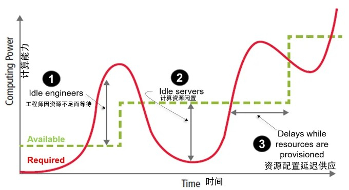 大家知道,芯片客户的需求永远是动态的,而传统数据中心的提供的资源是相对固定的,预算模型不能提前精确预估研发部门高峰期所需的资源,在流片前的签核(signoff)期间的需求有时会增加一倍以上,如果要扩容,则要经过相当长的时间和流程,而导致流片时间延长;而反之在非高峰期则计算资源处于闲置状态,导致实际生产效率低下。