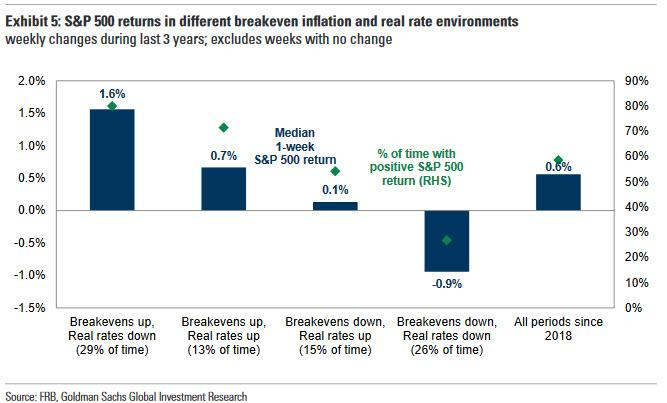 在过去三年里,股票回报最有利的背景是实际利率下降和盈亏平衡通胀上升的时期(就像现在)。自2018年初以来,这些时期标普500指数股票的平均周回报率为+1.6%。但在盈亏平衡通胀上升和实际利率上升的时期,回报率也高于平均水平(+0.7%),并且正回报的概率也大致相同(74%)。简而言之,过去3年,盈亏平衡通胀率的走势,而不是实际利率,更清晰地描绘了回报率。