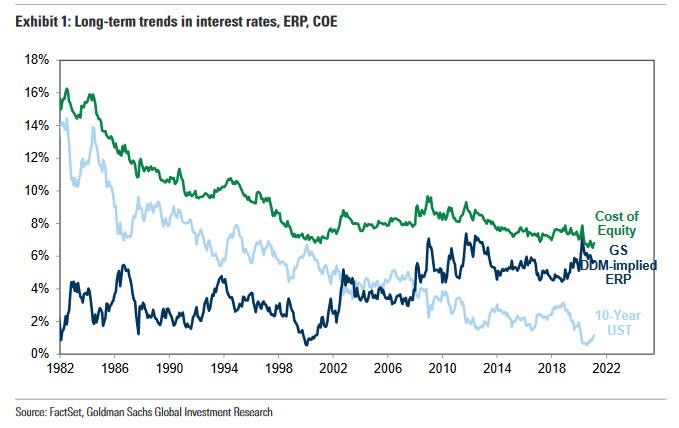 自辉瑞公司(PFE.US)去年11月初宣布有效的候选疫苗以来,美国10年期美国国债收益率已上涨近2%。然而,同期,由于投资者对经济复苏充满信心,标准普尔500指数股票风险溢价(ERP)下降了超过40个基点,远远抵消了高利率对股票估值的影响。从净值上看,股票成本降低了12个基点,自去年11月6日以来,标准普尔500指数已上涨11%。现在的ERP为5.7%,但与历史相比仍保持较高水平。