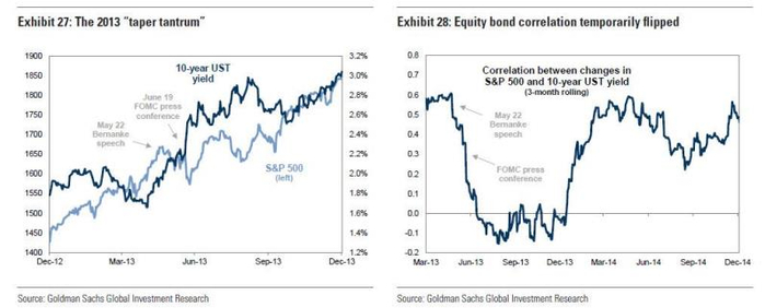 高盛预计,美联储将在2022年开始缩减购债规模,但许多投资者认为,强劲的经济复苏将导致美联储更早开始缩减资产购买规模,扰乱股市,类似于2013年的“缩减恐慌”。在“缩减恐慌”期间,标准普尔500指数最初下跌了6%,但最终恢复了上涨。时任美联储主席伯南克5月22日在国会露面时暗示,如果经济持续改善,美联储可能放慢资产购买步伐。随后,在6月19日的联邦公开市场委员会新闻发布会上,伯南克表示,联邦公开市场委员会预计今年晚些时候将适当放缓资产购买的步伐。在实际收益率的推动下,10年期美国国债收益率大幅上升,标准普尔500指数下跌1.4%。随着利率继续向3%攀升,标准普尔500指数在2013年第三季度难以维持新高。最终,股市的牛市继续前进,股票回报和债券收益率之间的相关性恢复了正相关关系。
