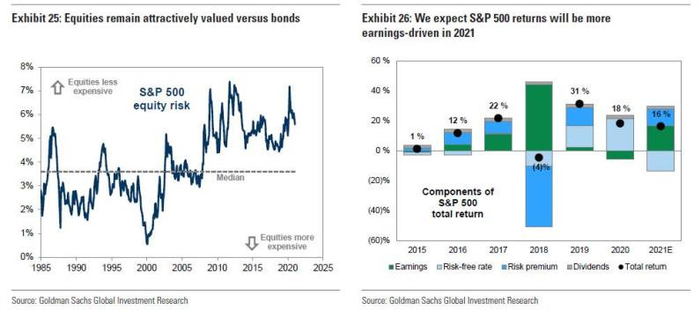 最后,尽管利率较高,高盛预计标普500指数将在2021年上涨14%,达到4300点,但该行预计“回报将更多地由盈利驱动,而非估值驱动”。这是值得注意的,因为标准普尔500指数在2020年的大部分回报率是由较低的利率推动的,这表明较低的贴现率可以抵消大范围衰退的根本影响。此外,高盛预计2021年加息将由经济增长改善而非货币政策推动。