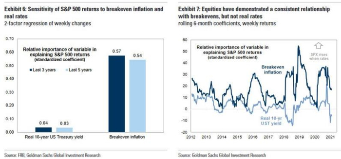 高盛随后指出,自2012年以来,标普500指数与盈亏平衡通胀之间的关系一直是正向的。在通胀预期较低且稳定的时代,盈亏平衡通胀的波动往往被视为增长预期和风险情绪变化的反映。增长预期的改善往往与盈亏平衡通胀率的上升、盈利预期的上升以及投资者情绪的改善相对应,而这些都大大抵消了贴现率的上升。从经验上看,对标普500指数盈亏平衡通胀和实际利率变化的回报率进行的双因素回归验证了这一关系。自2018年以来,盈亏平衡通胀率(考虑到实际利率的变化)每增加1个标准差,就会导致标普500回报率增加0.6个标准差。该系数在风险规避事件(例如,2016年2月,2018年12月)期间最大,在2020年2月市场达到顶峰之前最小。