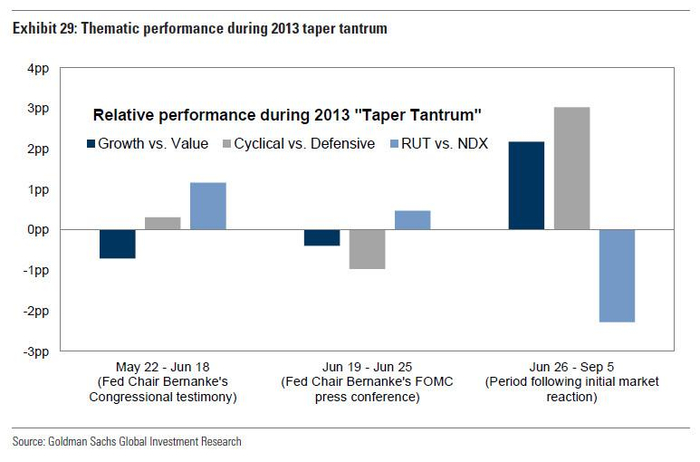 透过市场表面看,“缩减恐慌”期间的上涨板块各不相同。伯南克在2013年5月22日的首次讲话之后,10年期美国国债的名义收益率在一个月内上升了26个基点(1.9%至2.2%)。这段时间的上涨板块表现符合股市与利率上升的传统关系。然而,在美联储新闻发布会后,债券收益率在一周内上升了40个基点,宏观背景是规避风险,这与前面讨论的速度一致。尽管从历史上看,小型股和周期性股与利率上升呈正相关,但它们仍表现落后。从2013年6月25日到9月5日,随着利率逐渐上升,这些高贝塔系数策略的标的表现大大优于其他策略。有趣的是,增长型股票继续跑赢大盘,尽管利率也在上升。