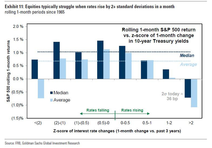 相反,高盛预计,利率变化的速度将成为股市更有意义的驱动因素。其原因是,股票通常能够消化利率的逐步上升。然而,当利率大幅上升时,股票通常会在给定月份平均下降,特别是利率在一个月出现两个或两个以上的标准差(以今天的价格计算,相当于36个基点)。同样,高盛还发现,当利率出现两个标准差的剧烈波动时,股票与债券的相关性通常会逆转。