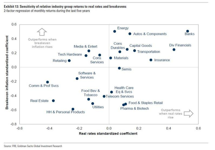 具体来看,高盛按名义债券收益率的不同组成部分细分了各行业对利率的敏感性。大多数行业对实际利率和盈亏平衡通胀都具有相似的敏感性。相信利率会走高的投资者应持有右上象限的股票,如能源、银行等;相信利率走低的投资者,则可持有食品饮料、软件、房地产等位于左下象限的板块。