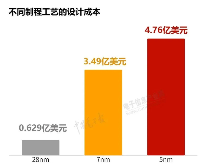 数据显示,28nm工艺的设计成本为0.629亿美元。随着制程工艺的推进,芯片的设计成本迅速上升。7nm工艺节点的成本暴增至3.49亿美元,5nm工艺所需成本更是高达4.76亿美元。