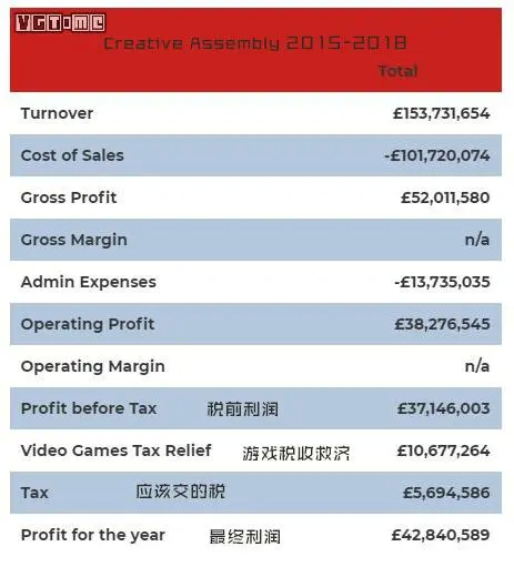 Creative Assembly 虽然没有 Rocksteady 薅得那么彻底,但从 2015~2018 年的收支统计来看,他们确实从 VGTR 里捞到了好处,期间总共获得了 1067.7 万英磅的税收救济,使得公司 2018 年的营业利润率达到 18%,远高于日本母公司世嘉 5.5% 的营业利润率。