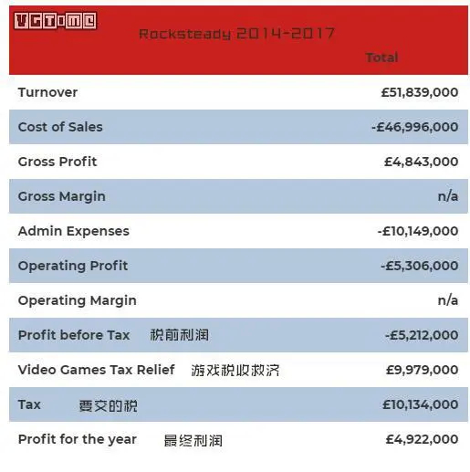从上图不难看出,在 2014 年到 2017 年间,Rocksteady 的税前利润(Profit before Tax)一共是 -521.2 万英镑。但他们莫名其妙多了个“游戏税收救济”(Video Games Tax Relief,以下简称 VGTR)的 997.9 万英镑收入,然后 1013.4 万英镑的税也没有交,最终反倒是盈利了 492.2 万英镑。