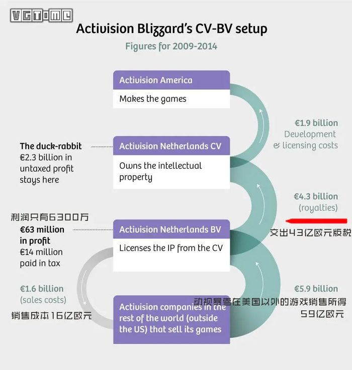 所以搞笑的事情出现了,ATVI CV 这么一个零员工、管理人员都住在百慕大首都哈密尔顿的空壳公司,在 2009 年至 2014 年间居然获得了大约 43 亿欧元的版税和 23 亿欧元的利润。