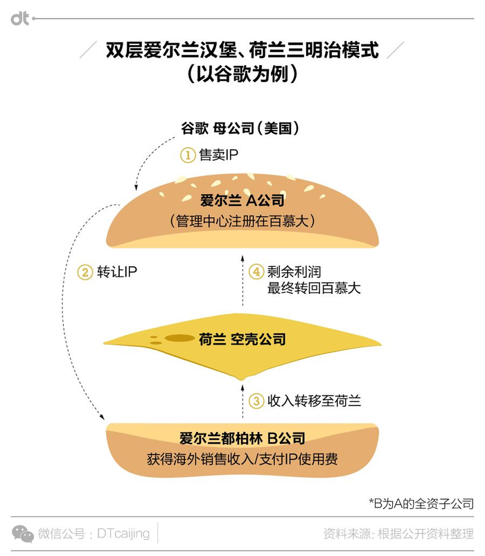 动视暴雪的这一流程,其实是被誉为“双层爱尔兰夹荷兰三明治”(Double Irish with Dutch sandwich)手法的变种,谷歌(GOOG.US)和苹果(AAPL.US)过去也经常用。简单来说就是爱尔兰和荷兰都规定,欧盟成员国公司之间的交易免缴所得税,利用“付版权费“的形式,资本家就可以把产品的销售所得汇入到管理中心注册在百慕大的公司,获得一笔免税储蓄。