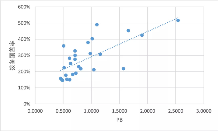 最后,我们列出银行的拨备覆盖率与PB的散点图,结论就非常清楚了: