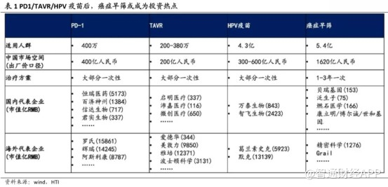 从行业发展空间和公司市值数据来看,目前PD-1国内市场空间约400亿元,相关公司恒瑞医药、百济神州不低于1000亿元;医疗器械行业TAVR的国内市场空间200亿元,相关公司启明医疗、微创医疗沛嘉医疗市值均超100亿元;HPV疫苗国内市场空间300-600亿元,相关公司智飞生物市值已超1000亿元。