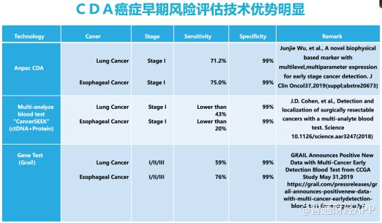 而安派科的CDA技术针对肺癌和食道癌的检测灵敏度分别达到71.5%和75.0%,检测特异性则与以上两款产品相近为99%。