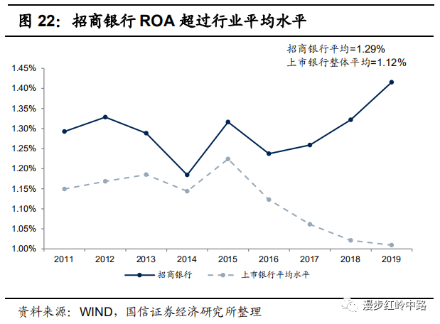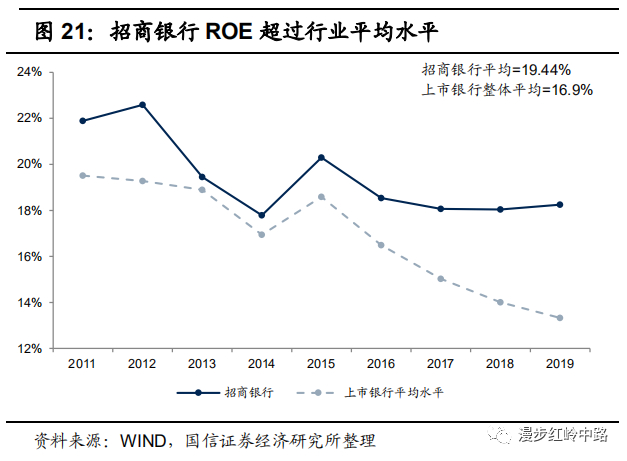 招行的ROE长期高于行业平均水平。截至2020年三季度,招商银行年化ROE高达15.7%,位居上市银行第一。拉长周期来看,招商银行盈利能力始终高于行业平均水平。2011-2019年招商银行年均ROA、ROE分别为1.29%和19.44%,分别高于上市银行平均水平0.17和2.54个百分点。