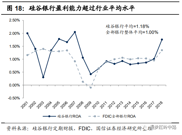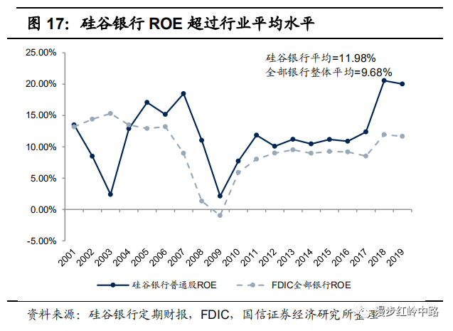 硅谷银行特殊的客群和一以贯之实行“商行+投行”战略,使得其实现了资金的良性循环,以较低成本获取了相对高收益,自2001年以来硅谷银行ROE、ROA平均水平始终高于行业整体水平。