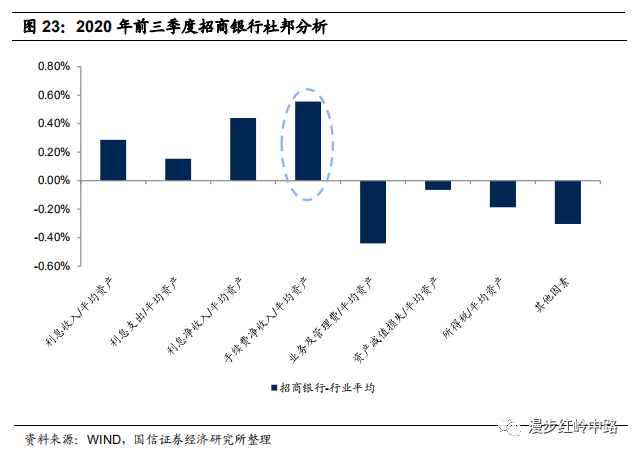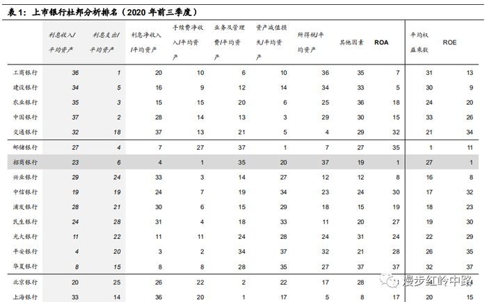 从杜邦分析来看,高“利息收入/平均资产”、低“利息支出/平均资产”、高“手续费净收入/平均资产”是推动招商银行盈利能力位居行业前列的重要因素。从2020年前三季度来看,招商银行“手续费净收入/平均资产”是推动其ROE的最主要因素。进一步将36家A股上市银行杜邦分解数据转换为排名来看,招商银行“手续费净收入/平均资产”位居全部上市银行第1名,反映了招商银行在当前利率市场化改革、净息差逐步收窄的背景下,“轻型银行”转型取得一定成效,收入结构更加平衡。