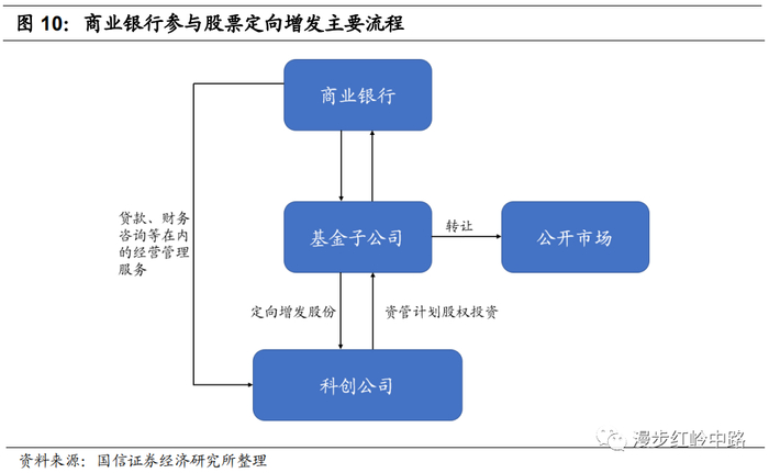 商业银行可通过参与结构化定向增发,在获取固定收益的基础上得到一定浮动收益。在定向增发业务中,商业银行主要通过基金子公司、信托子公司等机构下的专项资管计划参与上市企业的“定向增发”,投资股票、债券及货币市场工具等公开交易市场标准化金融工具。其中,商业银行可以根据投资者风险偏好不同设置优先级与劣后级,理财资金投资优先级产品。此外,在股票市场表现不佳、上市企业定增难度加大的条件下,可将投资结构设计成固定收益+浮动收益。锁定期满后,若市场行情不佳,上市公司大股东以现金补足固定收益的差额部分;若市场行情向好,投资管理方可以择机抛售股票,获取二级市场投资收益。