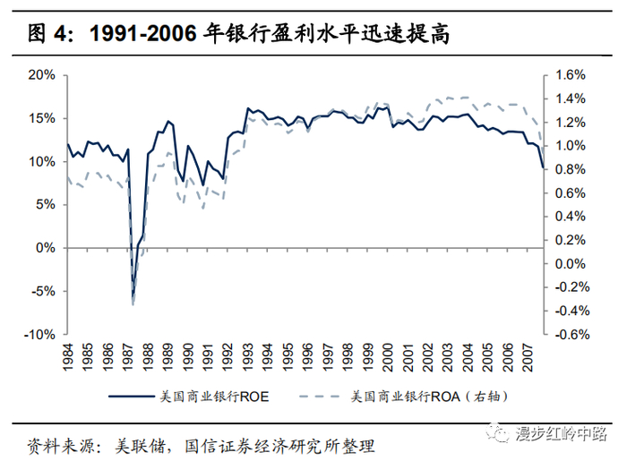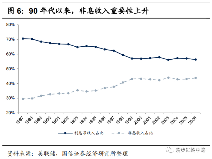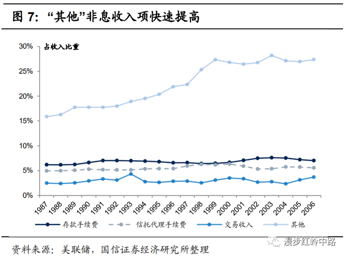 从国际经验来看,“商行+投行”的综合性经营模式能够在一定程度上拓展银行盈利来源、扩大市场份额、并提升一国银行业的国际竞争力。以美国为例,20世纪80-90年代美国商业银行从分业走向混业,在此期间,银行非利息收入持续增长,非银金融服务业务相对重要性不断上升,推动商业银行ROE水平大幅提升。1991-2006年美国商业银行平均ROE、ROA水平分别达到14.3%、1.22%,高于历史平均水平(1950-1985年美国商业银行ROA平均水平为0.72%)。贡献商业银行ROE水平上升的重要因素在于非息收入,据美联储数据,截至2006年美国商业银行非息收入占银行总收入的比重达43.7%,较1986年提高16.1个百分点。此外,进一步分析非息收入的构成,可发现包含证券化和投资银行业务等非银金融服务的“其他”非息收入项,是推动美国商业银行非息收入快速增长的主要原因,尤其在1999年后美国商业银行全面迎来以金融控股公司为代表的综合性经营模式,非息收入迎来快速上升期。