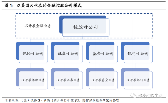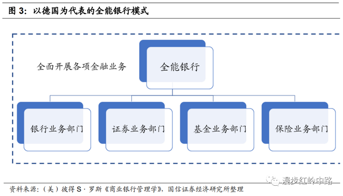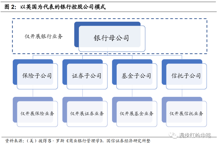 国际上银行业实现“商行+投行”的组织形式主要分为三类:分别以美、英、德为代表的金融控股集团、银行控股公司和全能银行模式。具体来看,金融控股公司模式,即纯粹性、管理型控股公司模式,母公司不经营具体金融业务,只从事对附属机构的股权运作和股权管理等,附属子公司经营包括商业银行、保险承销、投资银行等在内的金融业务。银行控股公司模式是母公司为经营性的控股公司,可以从事具体的银行业务,其他领域的非银金融业务则由其所控股的子公司进行。全能银行模式则允许商业银行直接从事所有金融服务业务,即“一个法人、多块牌照、多种业务”。