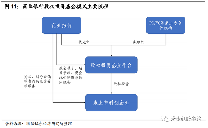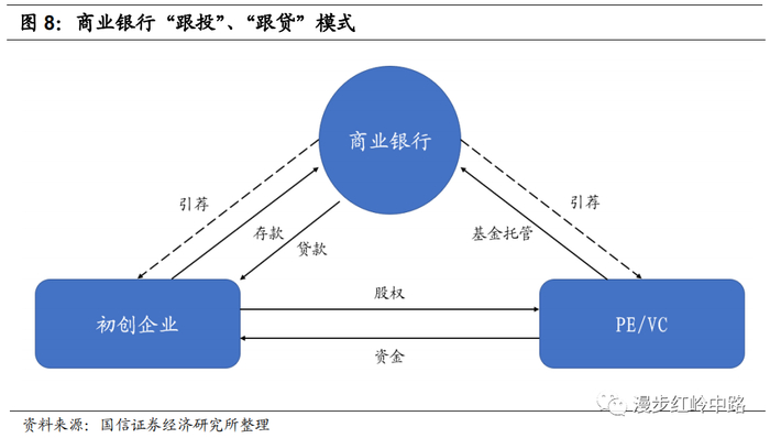 在以财务顾问为主要身份参与的“跟投”“跟贷”模式下,商业银行在收取服务费、托管费增厚非息收入的基础上,还能享受到优质客户融资过程中的沉淀存款和优质高效贷款。一方面,商业银行以“财务顾问”的身份,筛选优质信贷客户后,对其推荐品牌实力较强、专业水平较高或紧密合作的私募股权(PE)、风险投资(VC)机构,搭建平台以便双方沟通、协商,为PE/VC与优质客户牵线搭桥。在此过程中,银行不直接承担资产风险,但可对私募股权投资基金进行托管,而企业募得资金也有望在银行进行沉淀。另一方面,对于已有合作的PE/VC投资的优质企业客户,商业银行可提供特殊的信贷支持,即“跟贷”模式,通过建立“绿色通道”对合作PE机构投资的企业适当放宽信贷投放标准。