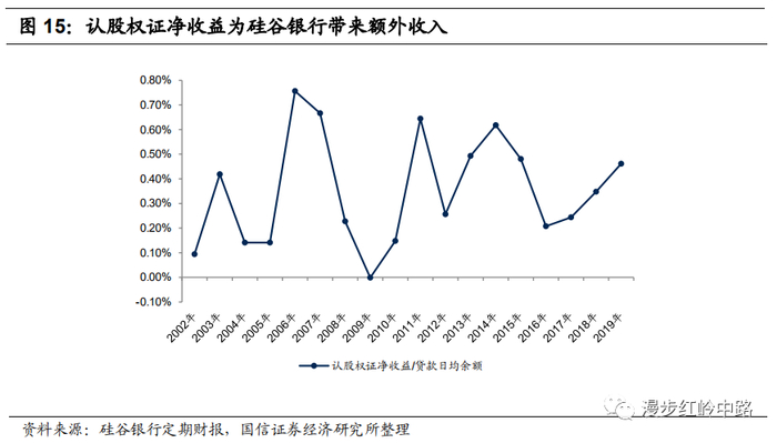 从营收来看,硅谷银行贷款收益率相对同业较高,同时非息收入是硅谷银行重要的盈利来源,其中认股权证相关收益是推动硅谷银行进一步取得超额收益率的重要因素。2019年硅谷银行非息收入占银行总营收的比重为36.8%,其中认股权证相关收入、投行业务占非息收入比重分别为11.3%和16%。由于硅谷银行专注服务于高成长企业及PE/VC,其发放贷款收益率因风险溢价高而显著高于同业。此外,认股权证相关非息收入还能进一步为硅谷银行带来额外收益。