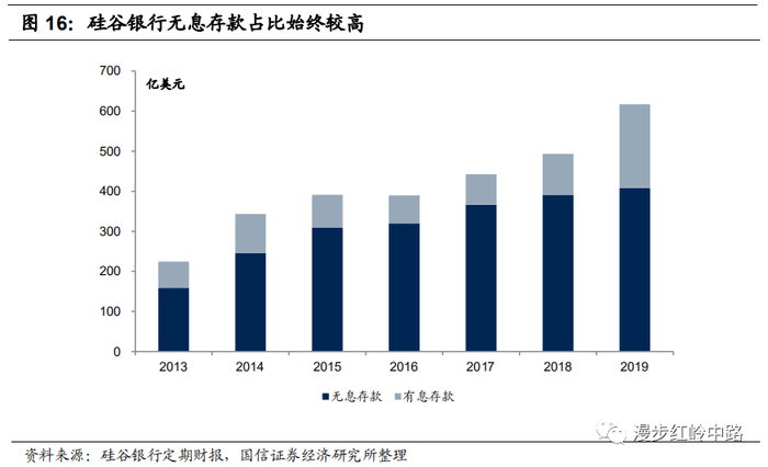 从存款来看,硅谷银行专注PE/VC与高成长性公司,实现资金良性循环,带来大量低成本存款。尽管近年来硅谷银行无息存款占比有所下降,但截至2019年末硅谷银行存款中仍有66%是无息存款,而全美商业银行中这一比例仅为16.5%。